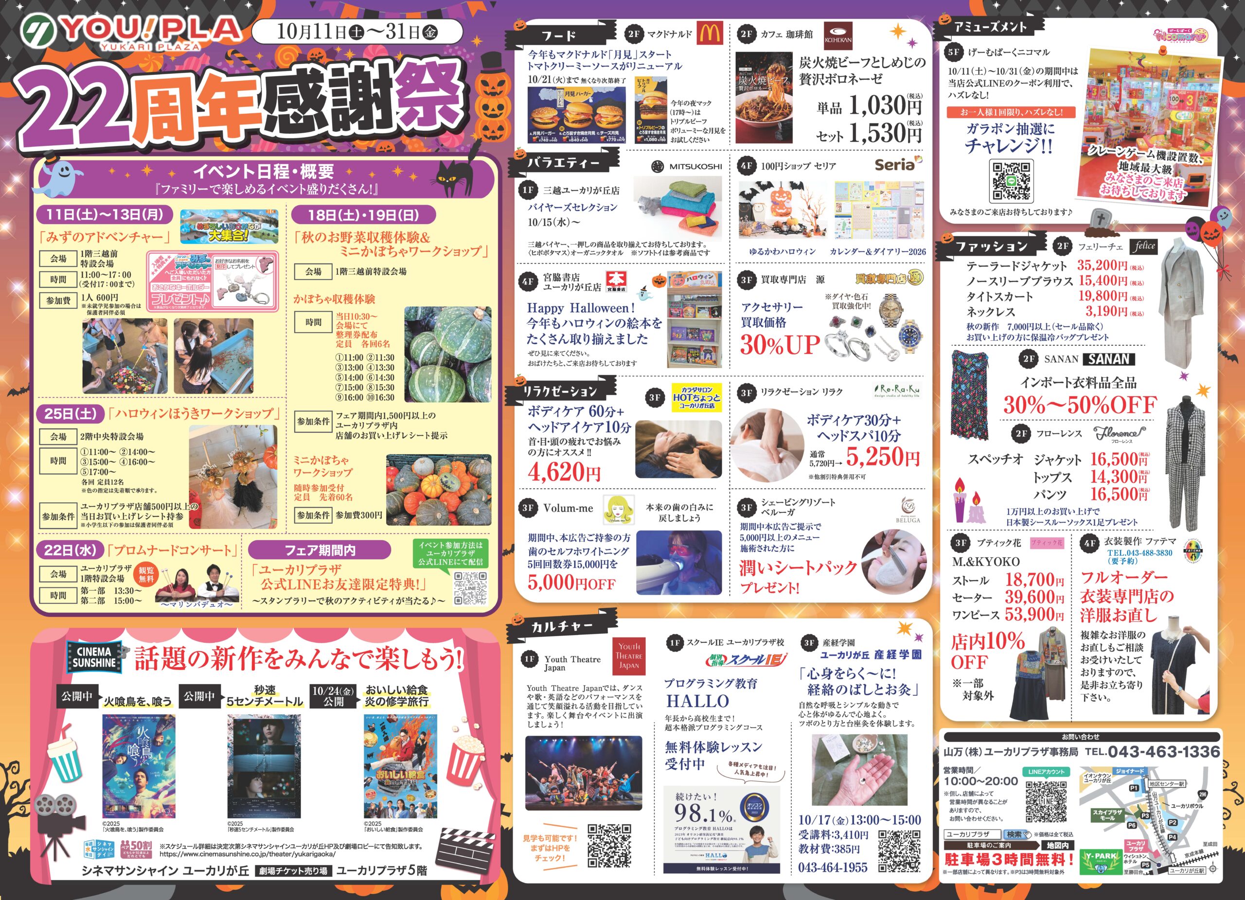 いつもご愛顧いただいている皆様への感謝の気持ちを込めて、『ユーカリプラザ 22周年感謝祭』を開催いたします‼️秋のお野菜収穫体験やハロウィンワークショップ、LINEスタンプラリーキャンペーンなどイベント盛りだくさんです🎃✨