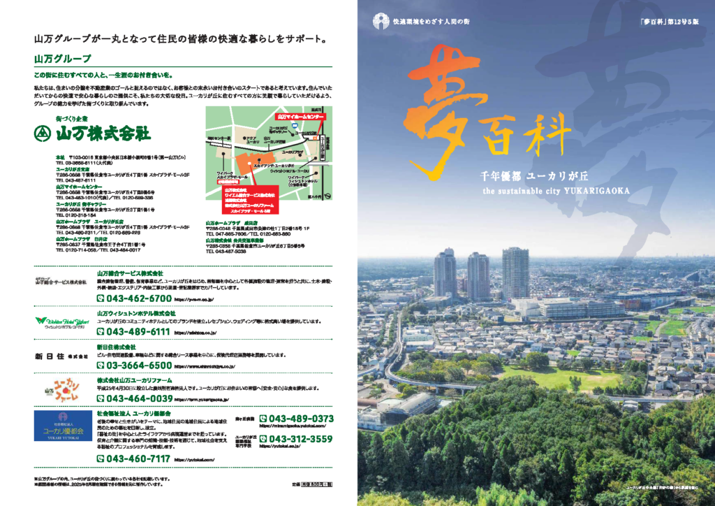 『夢百科』は、ユーカリが丘の開発コンセプト、ユーカリが丘の歴史、ユーカリが丘の独自の街づくり手法、子育て支援、医療、福祉などの各種サービスやシステム、そして今後の開発計画まで、街の情報がぎゅっと詰まった、ユーカリが丘のバイブルです。